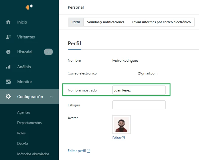 Escribo porque en el chat de mi cuenta y en las respuestas de WhatsApp, no me sale mi nombre, sino el del agente que tenía mi cuenta anteriormente.