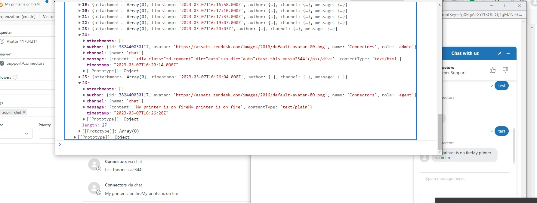 After sending this request I typed a message in the message box (in Zendesk's agent workspace) and clicked send. As you can see from the screenshot below, only the message sent in Zendesk's interface got returned to the visitor's chat window (even though the postman request's message is visible agent workspace).