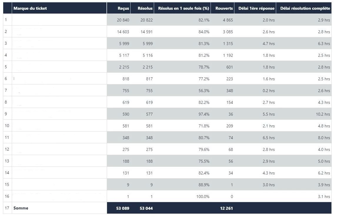 Par contre ils ne le sont plus pour les délais de résolution (où l'on totalise les délais de toutes les marques) ou le pourcentage de tickets résolus "en une fois".