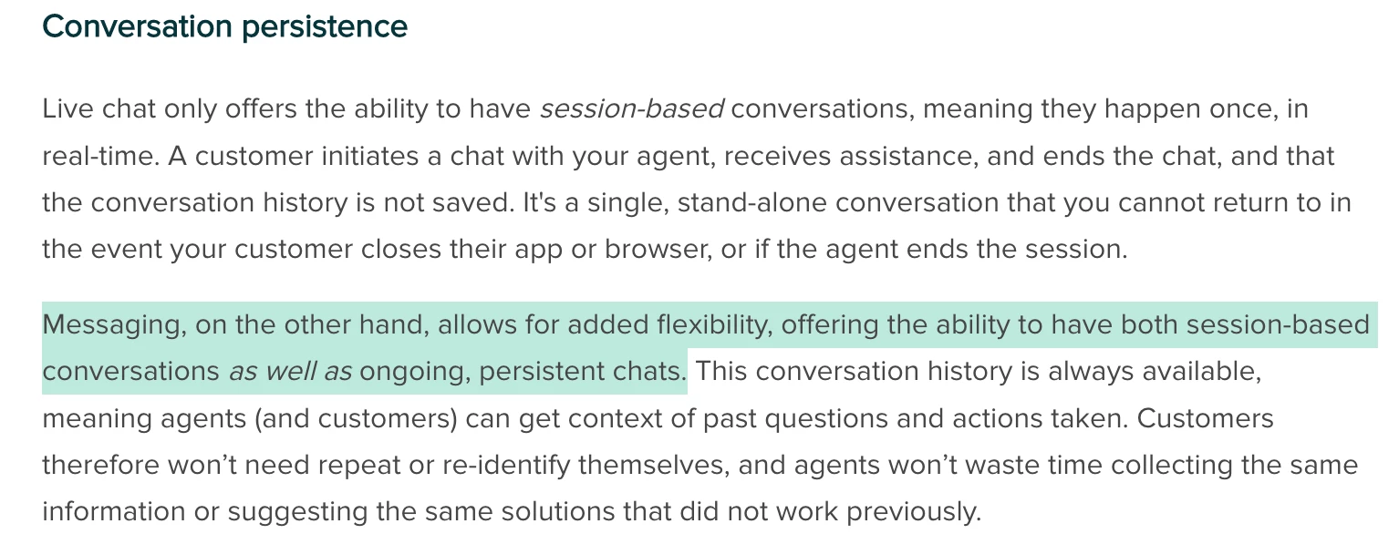 For example, this article explicitly states that it is possible to have session-based conversations with Messaging: Messaging vs. live chat: Which is right for you?