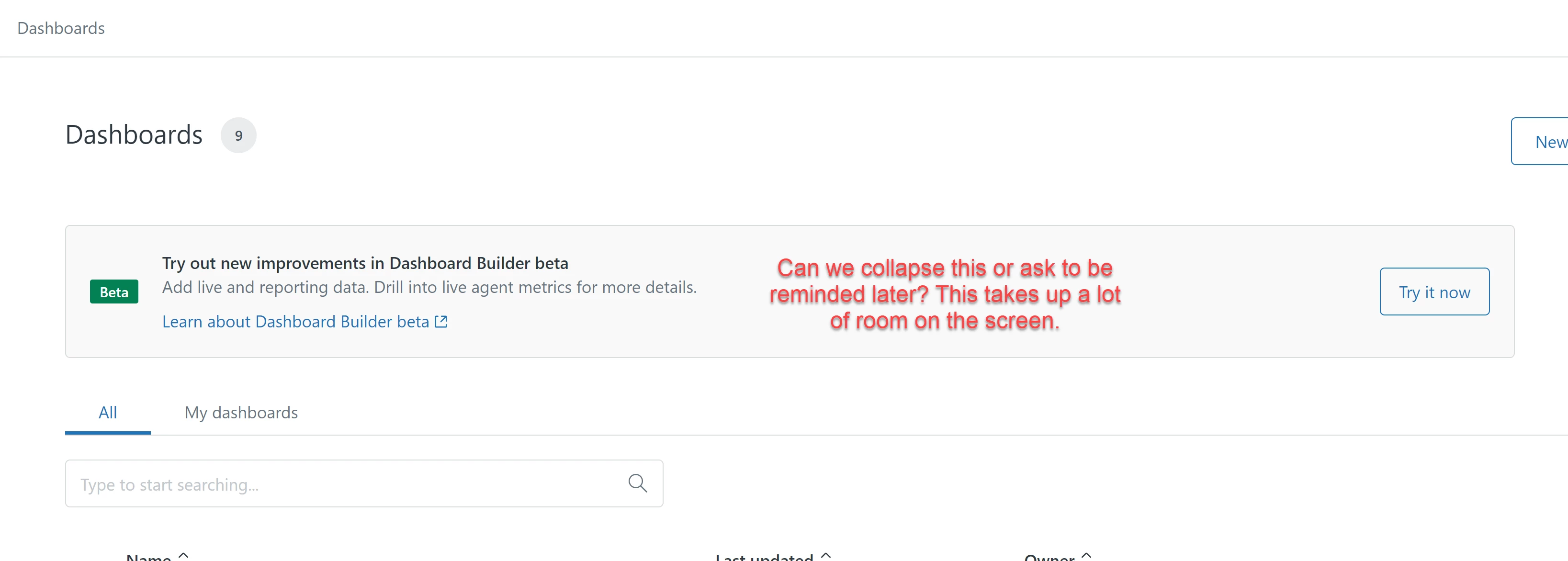 Explore Dashboard - can we hide or collapse "Try out new improvements in Dashboard Builder beta"?