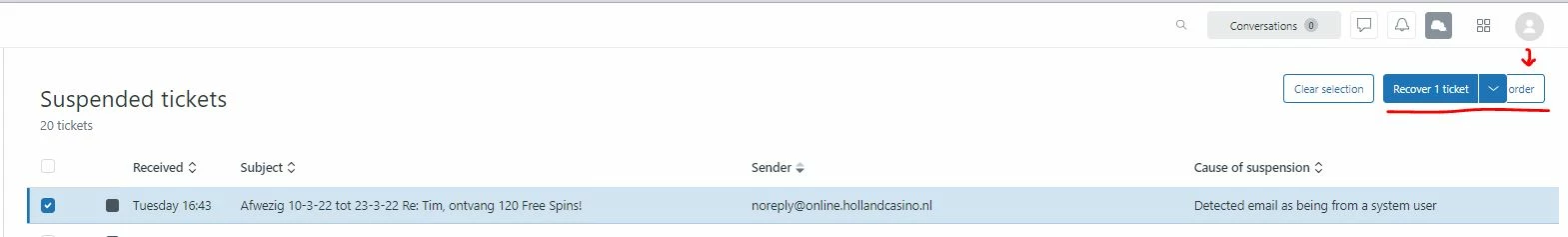 When I select the ticket I do see "Clear selection" and "Recover 1 ticket" buttons that overlap "Reset sort order"