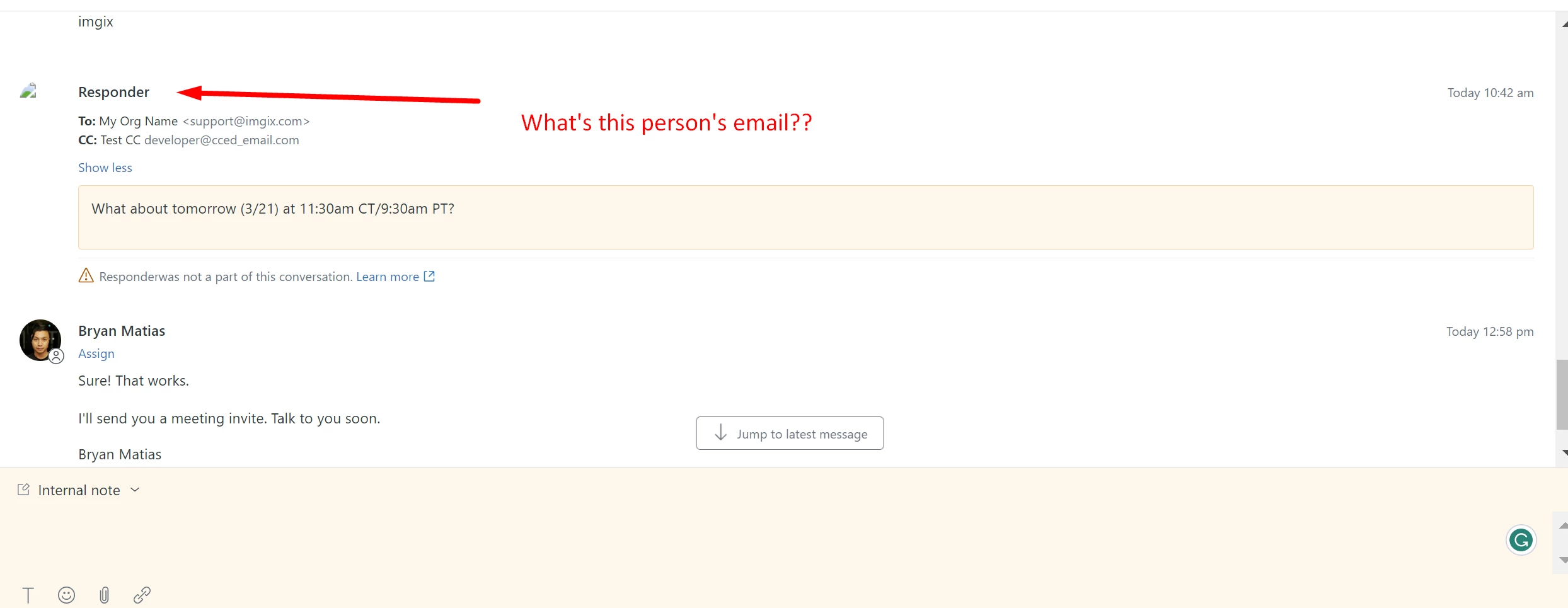 It's not easy to get the email of the responder in the new ticket view. See this example: