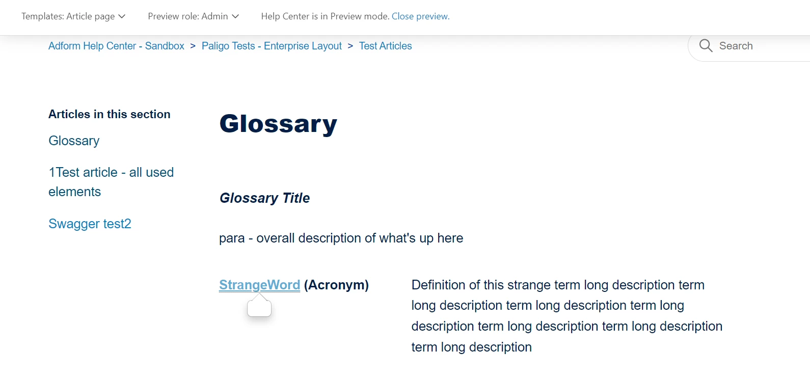 Inside another article, when hovering over the term, the tooltip pops up with the description from the Glossary - so that works fine.