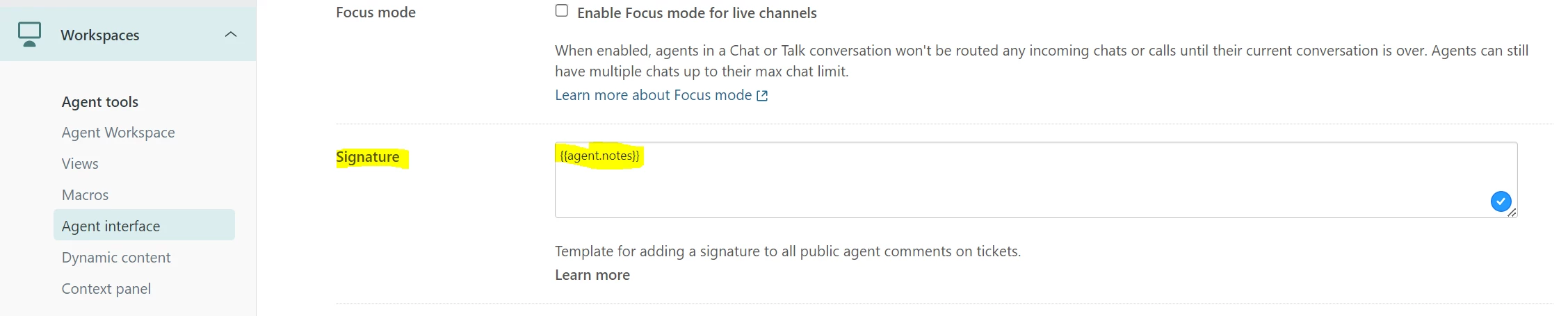 The quick Answer: Use placeholders to make your public ticket response signatures show the agent "notes" from the agent's profile, and use the "signature" section from your agent's profile only for "side conversations".