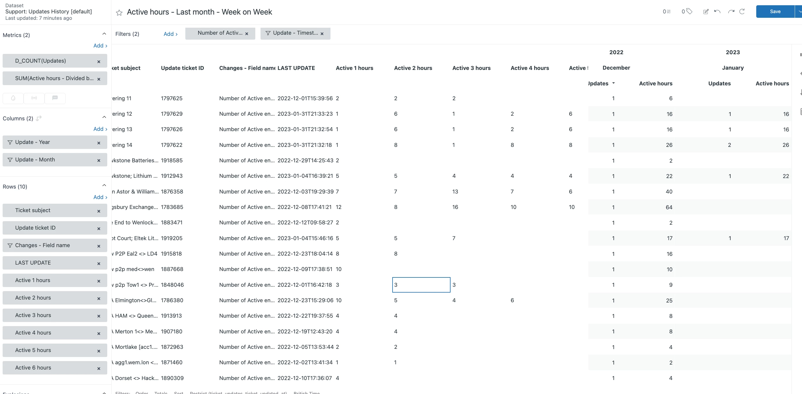 As you can see on the screenshot above, if the "Number of active engineers" per ticket is updated multiple times over a few months it will count the total hours for each month, essentially duplicating it.