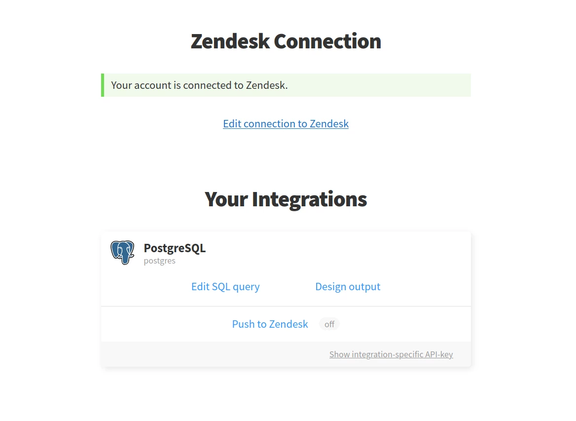 Now that you've successfully created an SQL query, return to the Integrations page in FactBranch and in the "Push results into ticket fields" box at the top click on "Connect to Zendesk".
