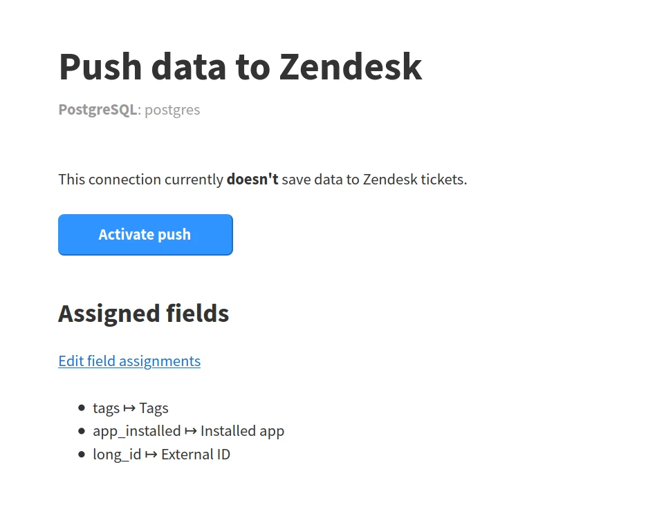 Click "Push to Zendesk" inside the box of the integration you've just created. You'll be forwarded to this screen, where you can select which fields from your query should be pushed into which ticket field.