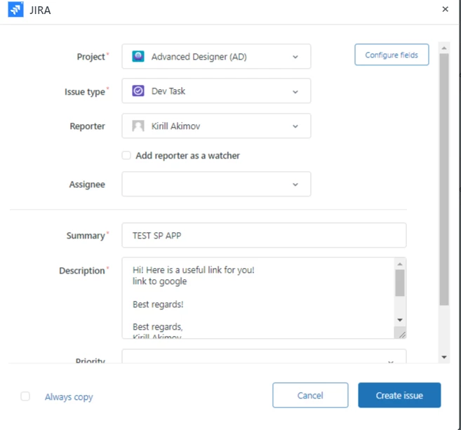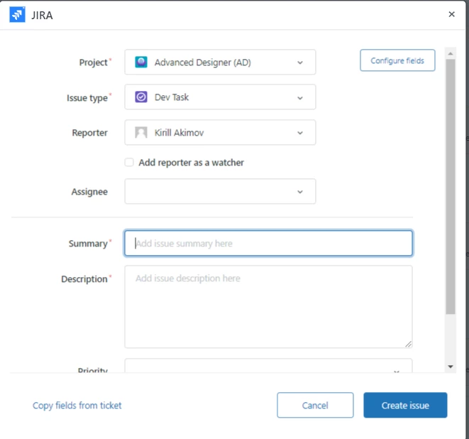 When the agent creates a Jira task via Jira App, he/she can click “Copy fields from ticket” button and some task's fields will be filled including description with the latest comment from the ticket.