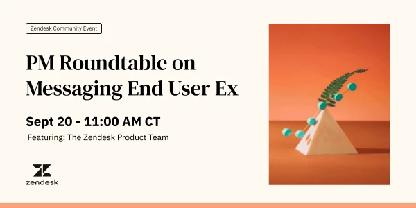 On Wednesday, September 20th, at 11 AM CDT, members of the Zendesk Product Team will join us for a special discussion and listening session on Zendesk's Messaging Experience. You'll have the opportunity to share your feedback directly with us in a live, open discussion about this aspect of Zendesk. So, please register today and share your questions, concerns, and use cases because we genuinely want to hear from you.