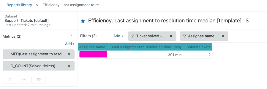The metric Last assignment to resolution time (min)" does not work. It will return negative values for assignment time if the ticket was assigned multiple times. This is a fundamental flaw in the base formula. It would need to use some sort of DATE_LAST_FIX to accommodate tickets that have had multiple assignments and multiple resolutions.