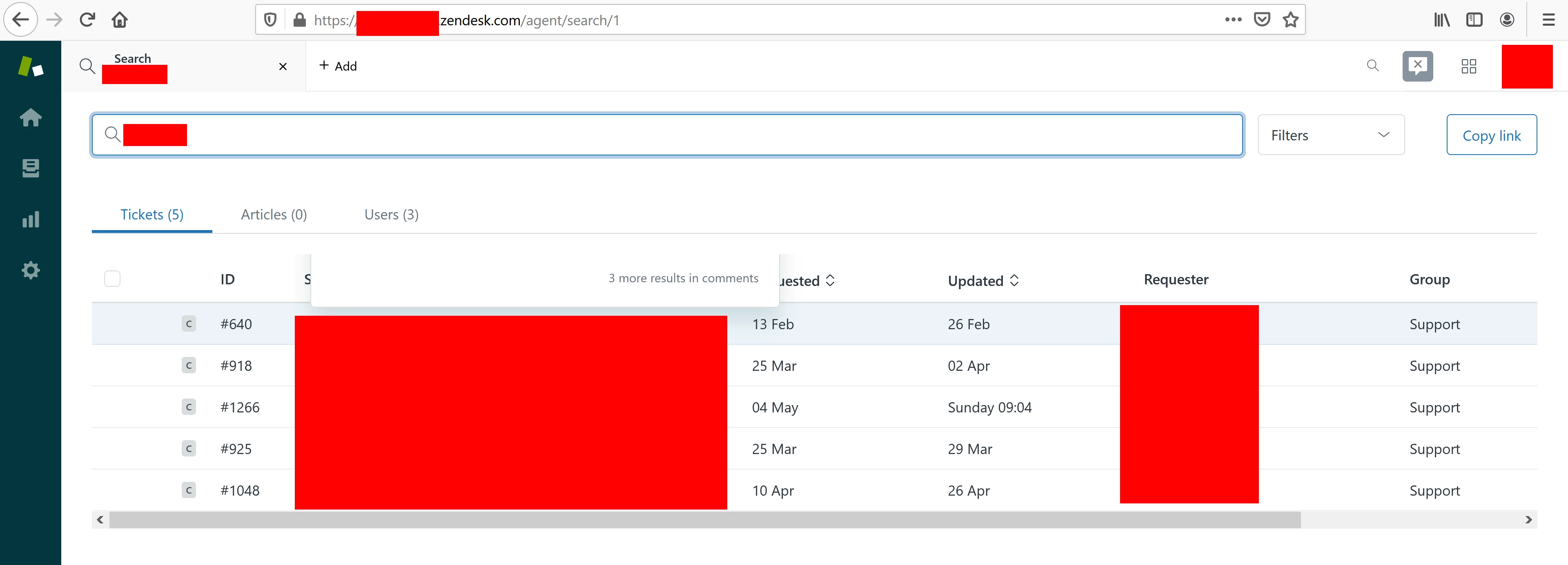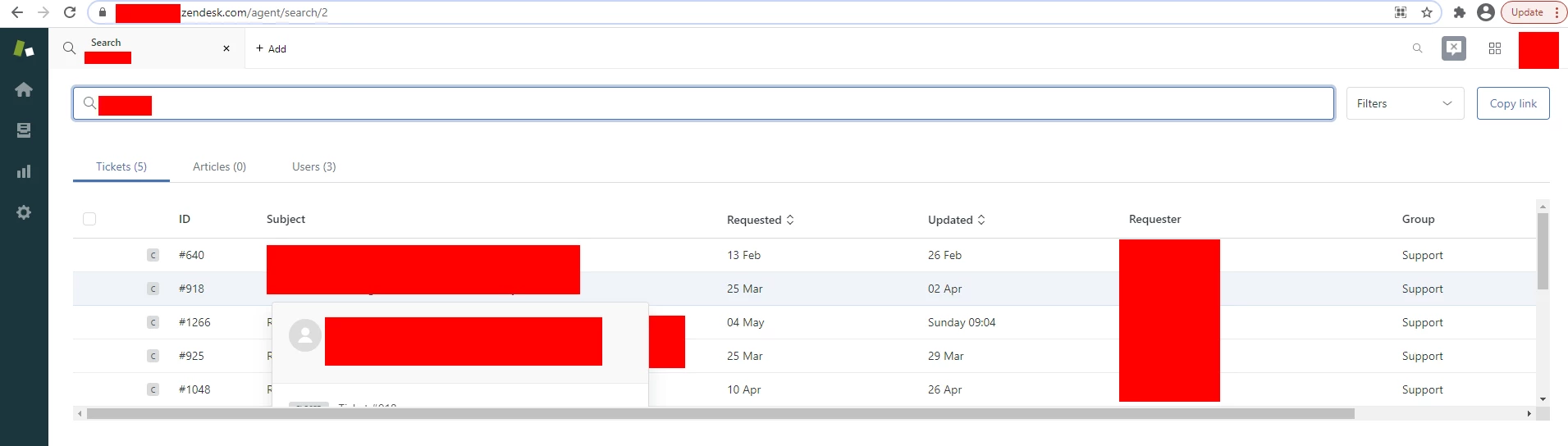 When using the ticket search feature, the search results are returned in a grid. When I hover over a specific search result, a small pop-up appears with ticket details in it, however it's not possible to read the details because the pop-up disappears behind the grid's scrollbar. The screenshot below shows how it looks in Chrome, and Edge is the same.