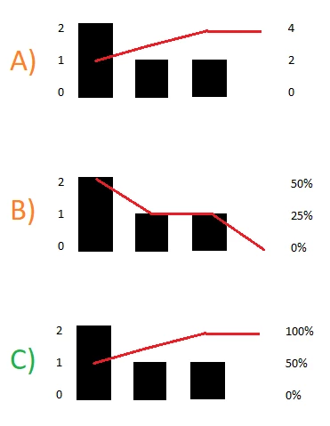 Below is a MS Paint mockup explaining further how this differs from the current features. "A" shows the current "Running Total" feature (note the axis on the right is not a percentage of the total, but a count). "B" shows the current "% of Total" feature (note that the line does not show a running total, even though the axis measurement shows a percentage of the total). What I need is "C": a running total as a % of total lines, or cumulative percentage.