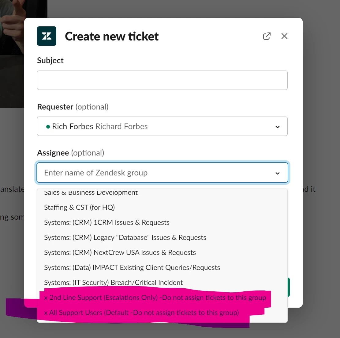 In SLACK, it is not possible to hide groups from being selected by a user. We use groups to drive workflows and I am having to give them long, clunky names to try and discourage users from simply selecting any group (including default/unused groups and 2nd/3rd line groups are added as the assignee in the first instance. This screws up our TRIAGE workflow. This seems like an obvious fix to be able to limit the displayed groups (in the same way you can limit which forms are displayed to customers in the Zendesk "Submit A Request" form