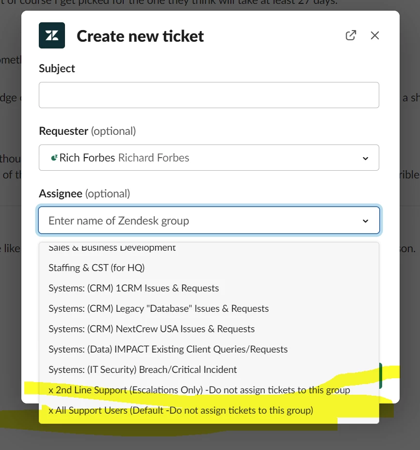 We need to be able to EXCLUDE some of these groups from the assignee field in SLACK. As you can see I have had to rename the groups with clunky names to try and reduce this behaviour, but this looks untidy everywhere you see the group name.