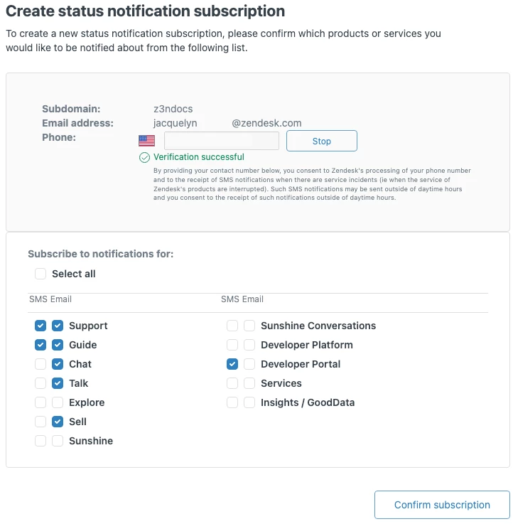 If you would like to sign up for SMS notifications, please visit the following article for a step by step guide to configure your notification subscription. You can also subscribe directly from the Zendesk status page. Agents and admins have the option to subscribe from their Support account (see screenshot below).
