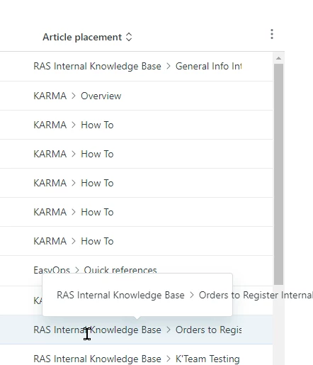 Business case: It would be easier for content creators to sort articles by category and sections rather than just the combined Article Placement. Specifically, because the titles of our categories and segments can get lengthy. Notice the image below where I can't see the rest of the section name, not to mention if there was a subsection...I tried resizing the columns but I don't seem to be able to do that either.