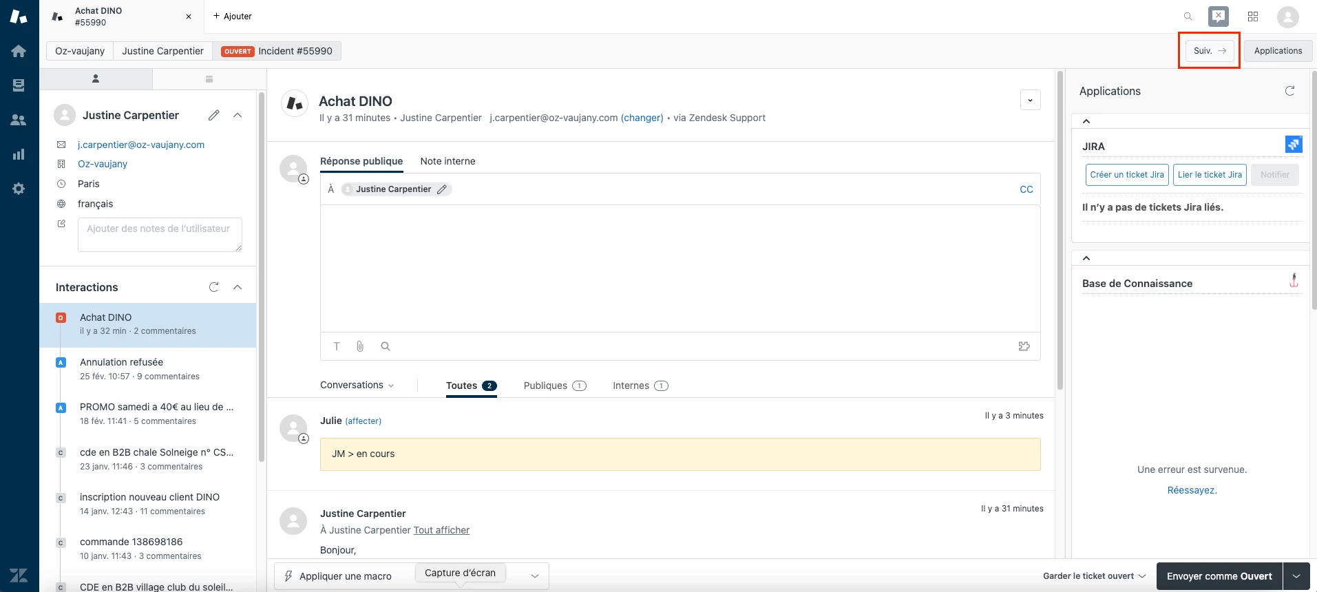 1) Actuellement lorsqu'on on ouvre une pile de tickets, on tombe par défaut sur le premier ticket de la pile puis il est possible de passer aux tickets suivants via la flèche en haut à droite (cf PJ). Mais il n'est pas possible de revenir sur le ticket précédent.