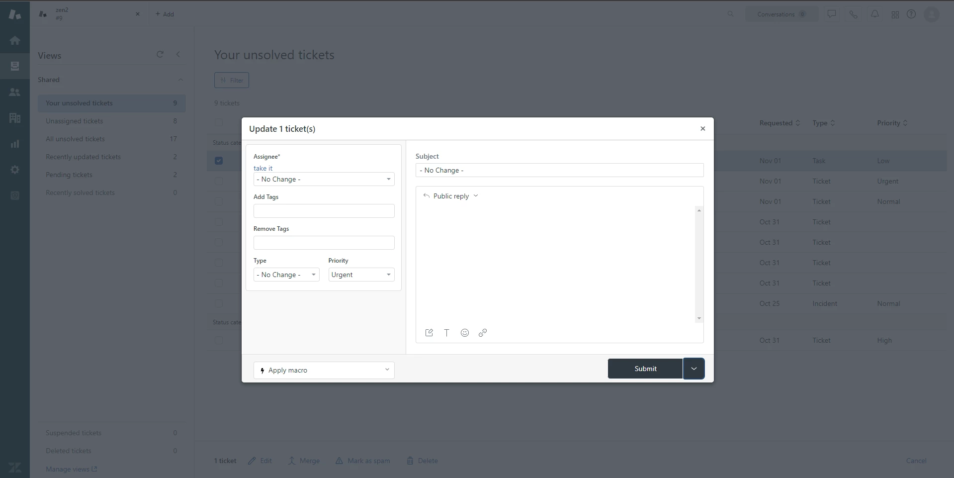 I have created a zendesk app using the zaf framework and included the background location for listening to ticket save action. The ticket.saved event does not get fired when the ticket is updated from Views Page (Screenshot attached below).