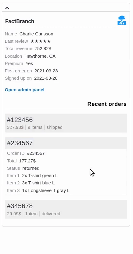 As you can see this is part of the FactBranch app, that you can install in Zendesk Support, Sell and Chat. FactBranch loads customer data from your database, Google Sheet or REST API and displays it in the sidebar in Zendesk.