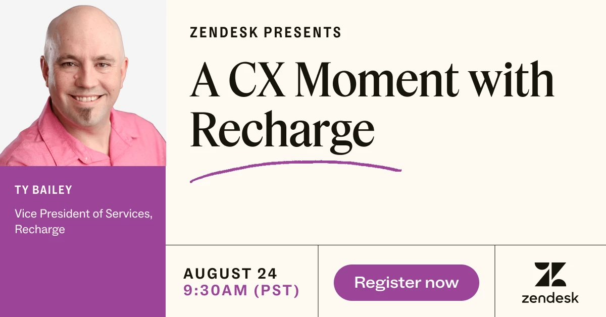 Next week, Zendesk will host a 30-minute rapid-fire conversation with Zendesk’s Roisin Hunt and Ty Bailey, Vice President of Services at Recharge Payments. They will discuss how to: