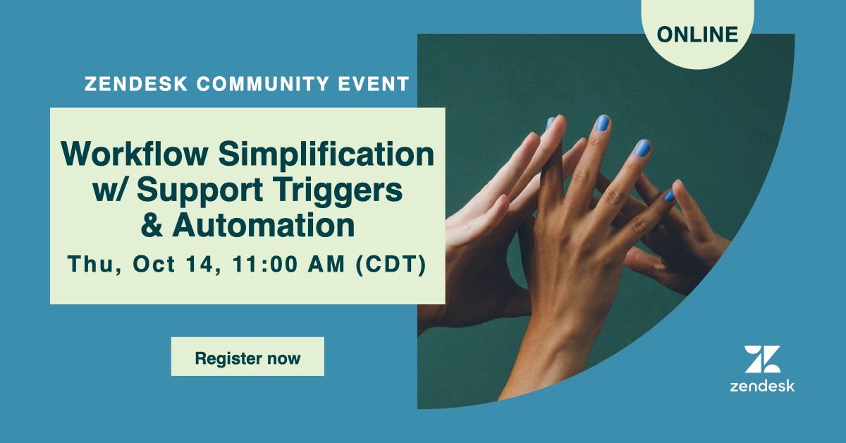 On October 14th, at 11:00 am CDT, the Zendesk Community will be hosting a live Q&A session covering workflow simplification via Support triggers & automation. Our experts will include members from the Zendesk Product Team and our very own Zendesk Community Moderators! Our team will be on deck answering questions submitted by community members, so make sure your question gets answered and Register today!