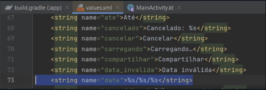 The error: values\values.xml:73:5-42: AAPT: warn: multiple substitutions specified in non-positional format; did you mean to add the formatted="false" attribute?.
