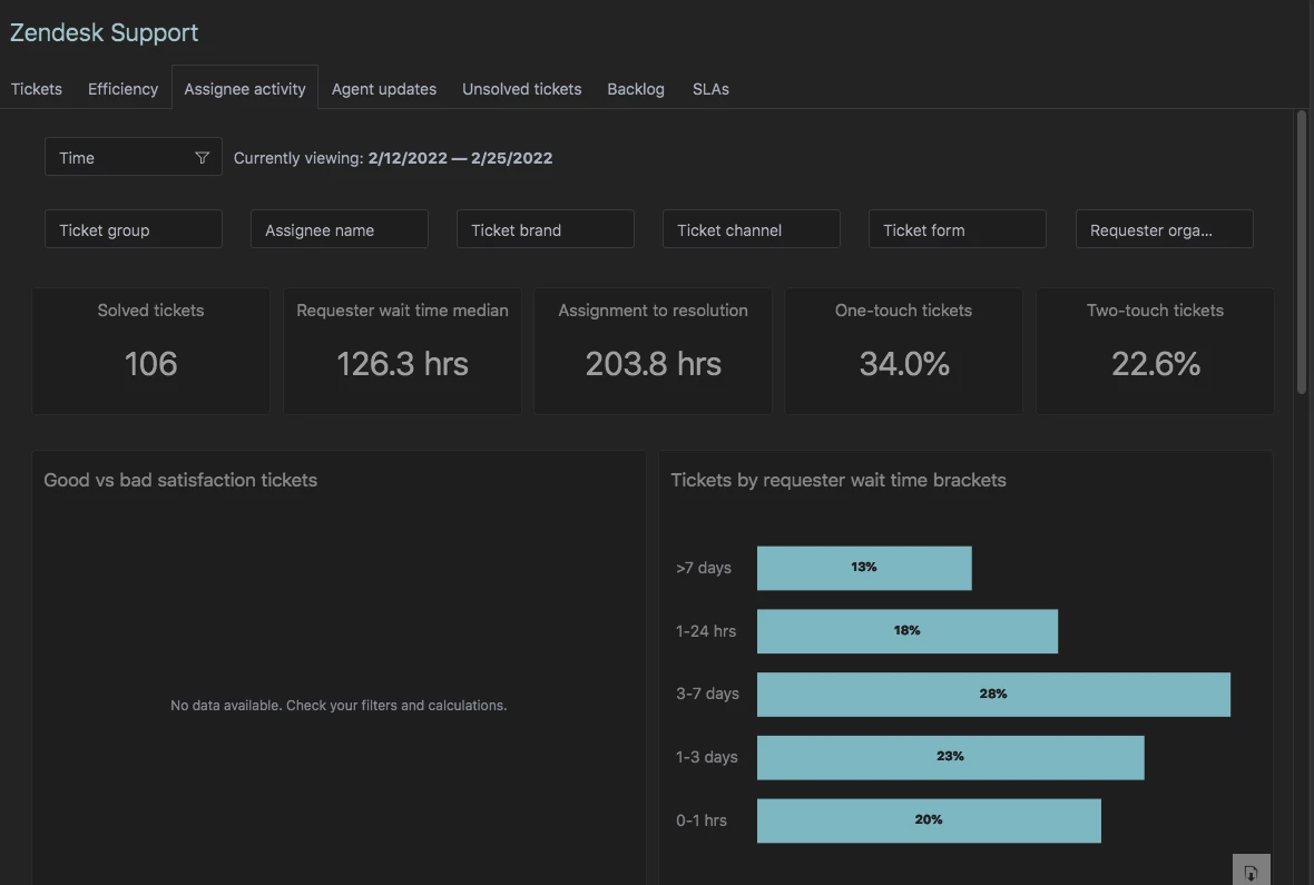 I'm making this post in hopes that we can get a bug fix implemented on Zendesk Explore: Canned Reporting. To replicate this issue, you will go to Zendesk Explore > Assignee Activity > Tickets by requester wait time brackets. This graph has a UI/UX issue where it shows 1-24 hours in between 3-7 days and > 7 days when it should be in between 0-1 hours and 1-3 days.