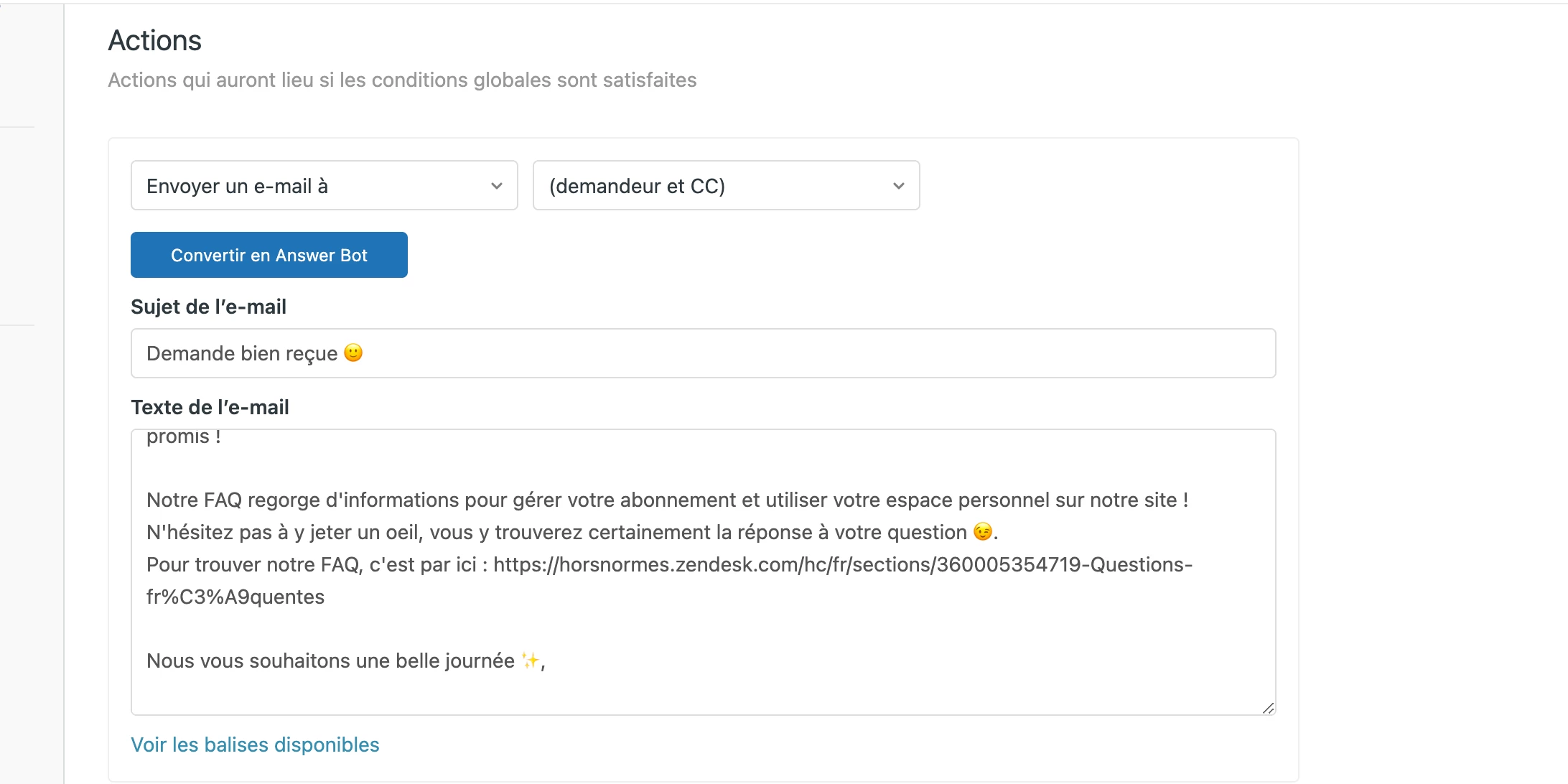Je voudrais faire quelque chose de simple : ajouter le lien vers notre FAQ Zendesk au message automatique envoyé à la création d'un ticket. Cependant, je ne vois pas comment faire. Est-ce que quelqu'un a une solution ?