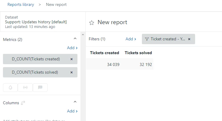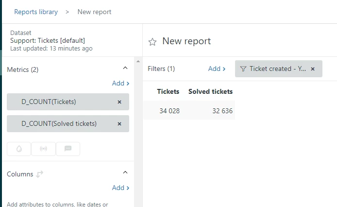 • If you want to get 100% accurate stats on the number of existing tickets that were created and resolved in your account use the Tickets dataset. Create two separate reports one filtered by the ticket creation date and another one by the ticket resolution date.