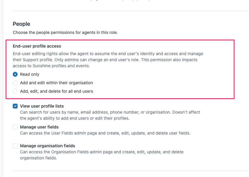Below is a screenshot for a custom role setting where you can select what access the agent has to user profiles.
