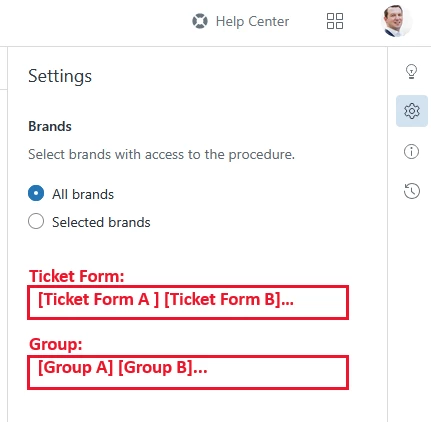 Zendesk Procedures should be limited not only to a Zendesk brand, but also to ticket forms and support groups.