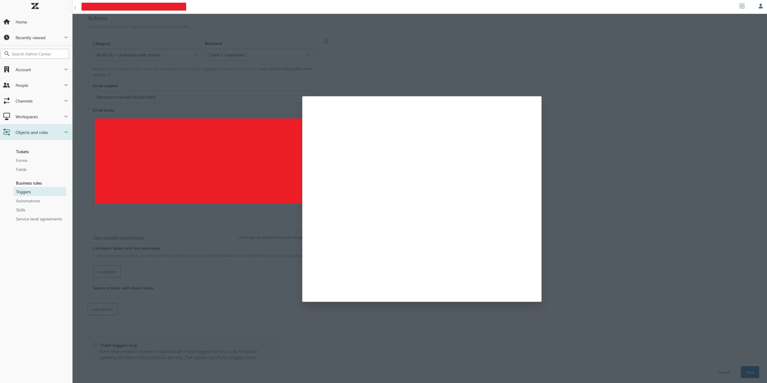 Currently, team members whose role includes permissions to add, edit, and delete triggers, are able to view autoreply triggers but only see a blank dialog when clicking the “Configure” button under “Configure labels and test autoreply”. i.e. these team members can publish a trigger to send autoreplies but cannot configure the article labels that the autoreply should search.