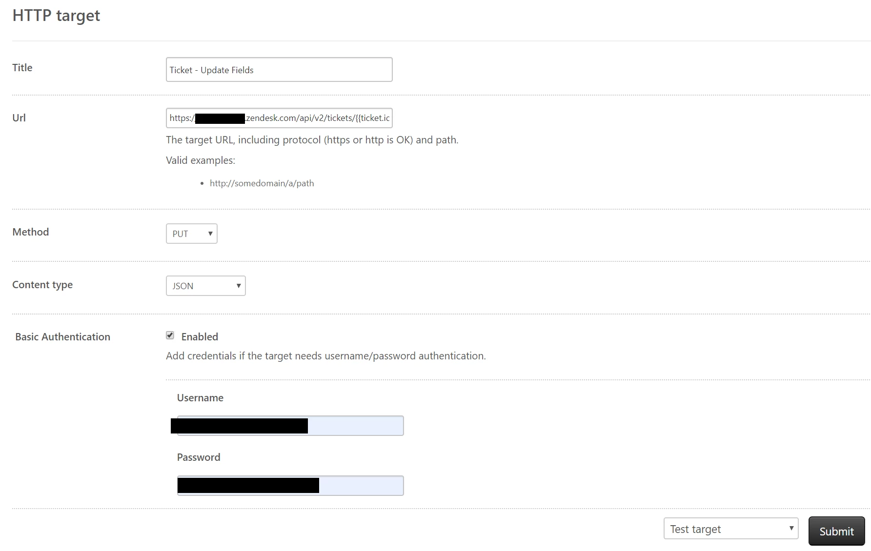 Note that Zendesk is just another "external" target in this context. My setup for a target to update Zendesk tickets is: