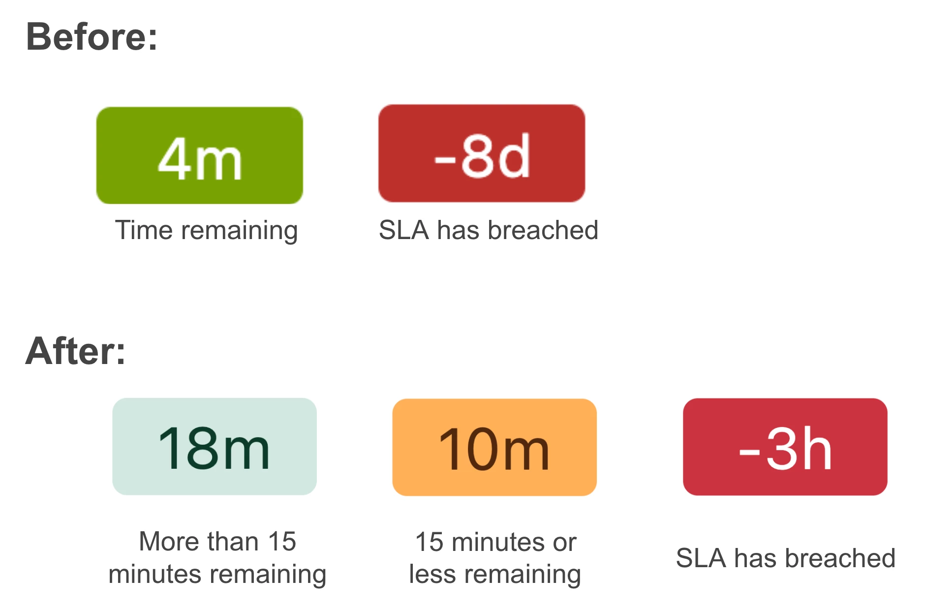2. I'm aware of the Automation notifications, but it would be a nice touch if you could set certain times before an SLA breach (30 mins, 1 hour, etc.) where the countdown would turn yellow.