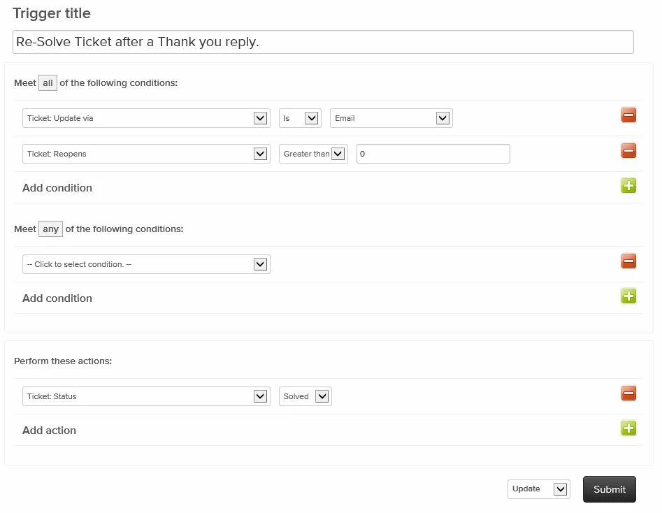 Yes you can make a trigger function which would allow any ticket that has the words ' Thank you ' in it to be solved but this isn't a viable option.