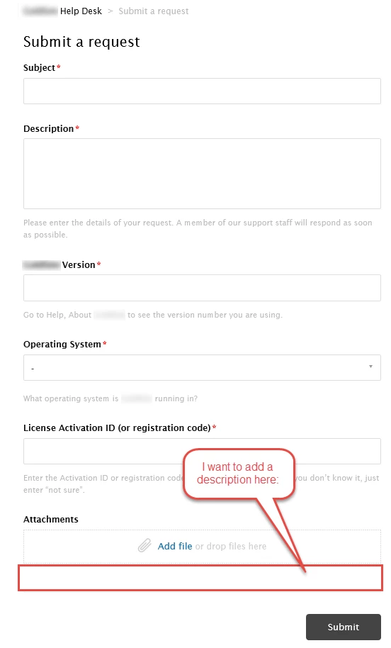 At the bottom of our "Submit a request" form in our Help Center is an automatic upload form for adding attachments. I would like to add a description similar to the description I've added to my other fields. The problem is, the Attachments field is not accessible in our Ticket Fields Admin Settings so I'm not able to add a description yet I am able to add one to all the other fields (i.e. Subject, etc). Below is an example showing our "Submit a request" form for context.