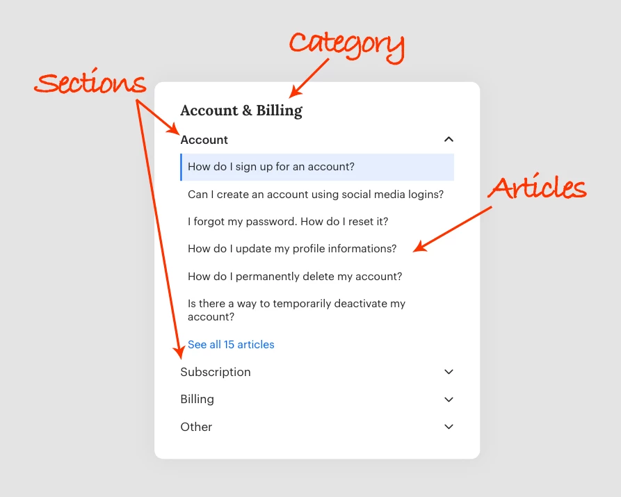 It will have the Category of that article as the main link, all the sections as collapsible elements and all the articles listed inside each sections. (see the screenshot of my mockup below).