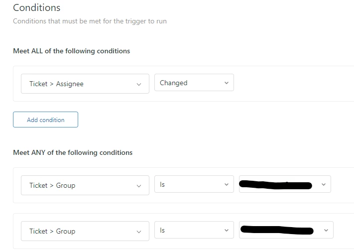 We are running into an issue where all agents in a group receive an email notification when a ticket is assigned to an individual agent in that group. We want to have 2 triggers. One that emails the GROUP a notification when they get re-assigned a ticket. And one that ONLY sends an email notification to the AGENT who is assigned to a specific ticket. However, both triggers are emailing the group regardless.