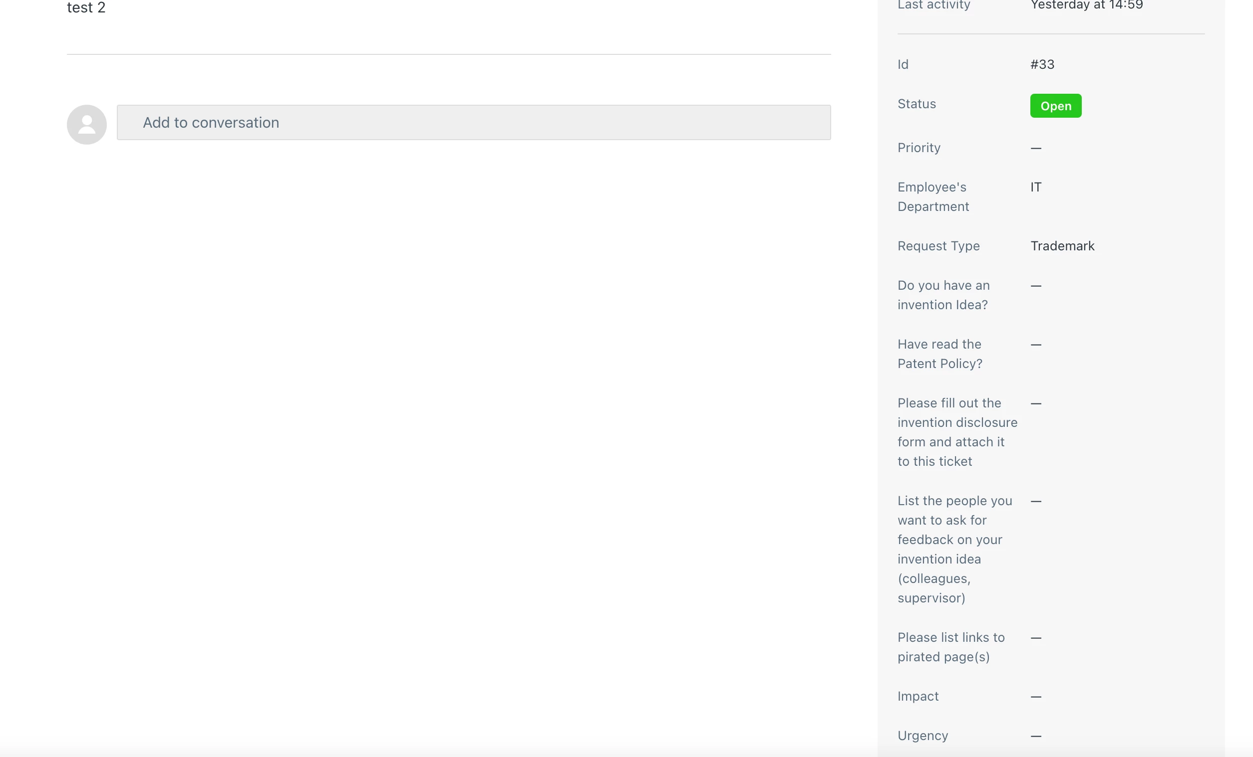 Here is an image for clarification, in the image below the fields under "request type" should not be showing up if the request type is not "Policy","Patent" or "Piracy". The conditional formatting is set up correctly for both agents and users: