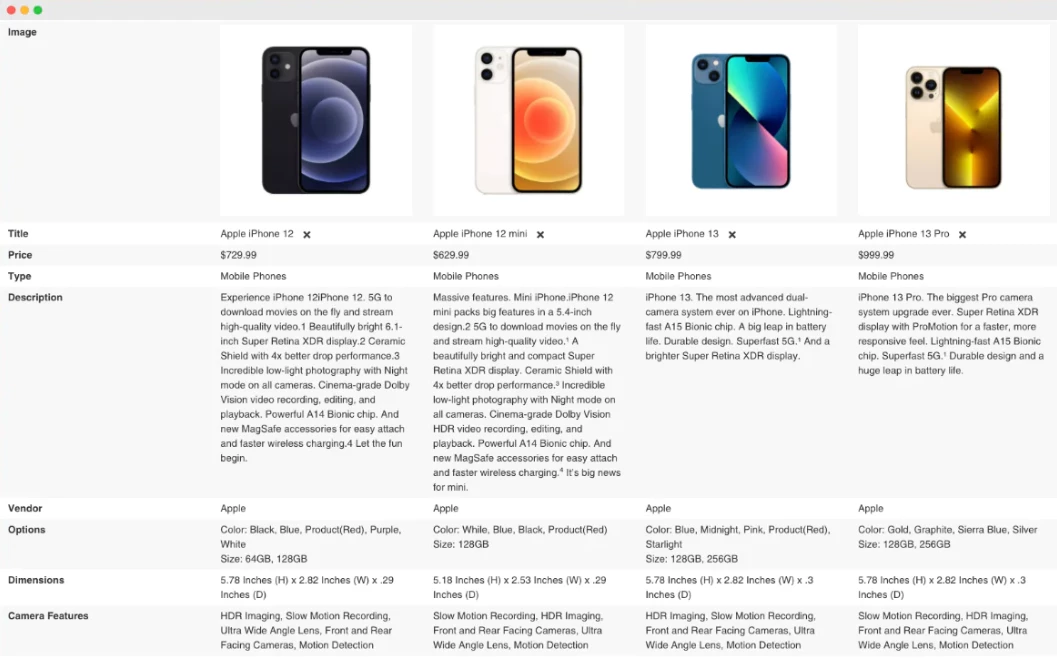 I'm looking into a possibility to show product features and functions (or any other function comparison) next to each other in a table format, like it's done in shopping websites: