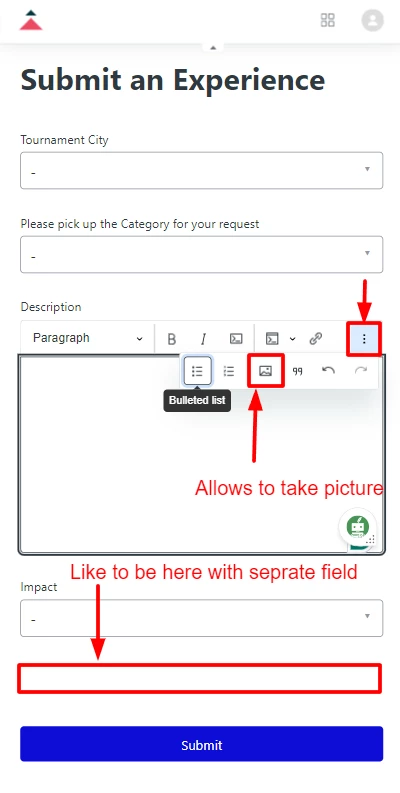 - Add the option of taking pictures on the front page of the web form instead of keeping it hidden. (FYI, we do not want to use the attachment option to enable it.)