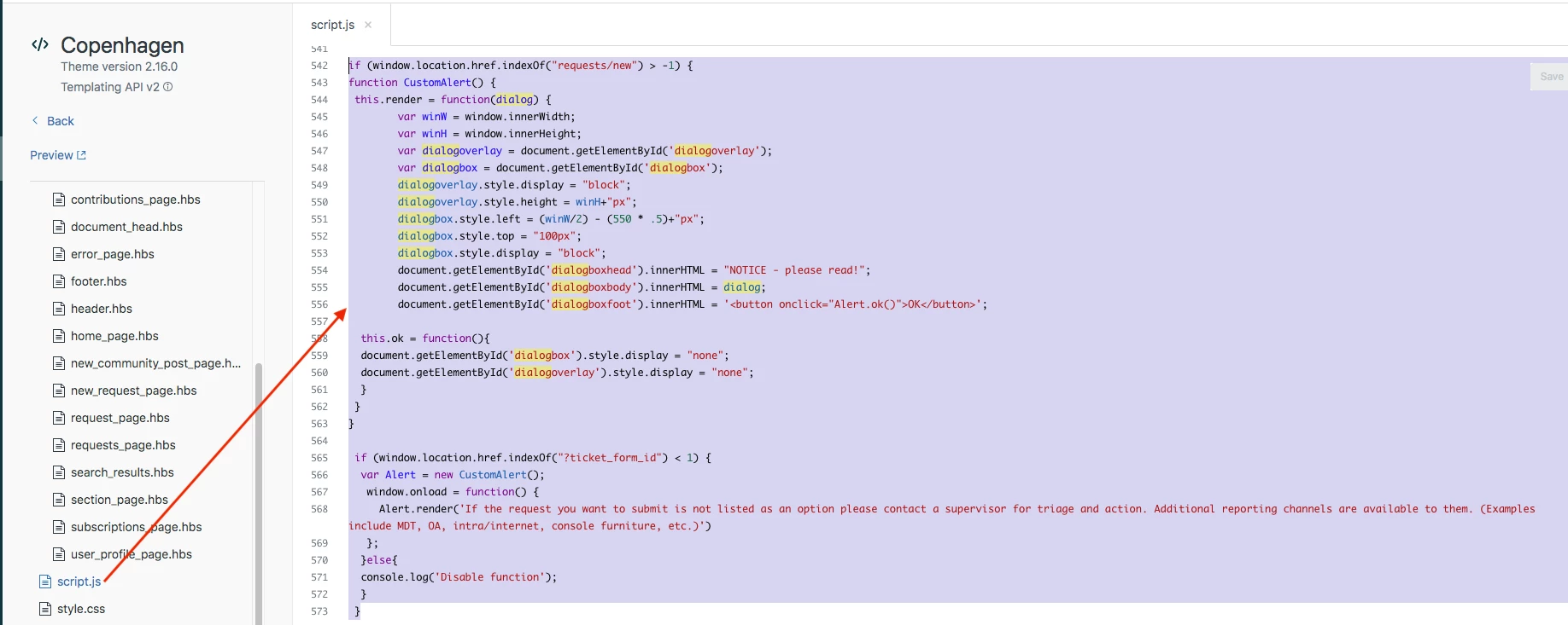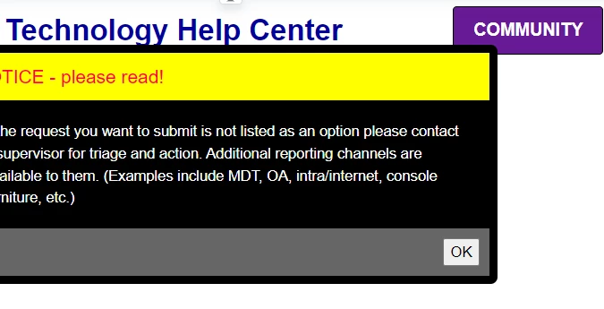 <body onload="Alert.render('If the request you want to submit is not listed as an option please contact a supervisor for triage and action. Additional reporting channels are available to them. (Examples include MDT, OA, intra/internet, console furniture, etc.)')">