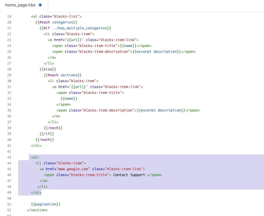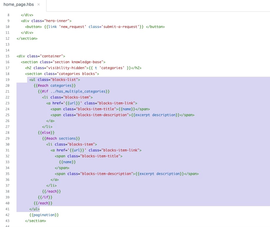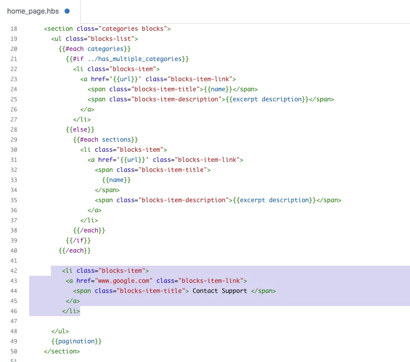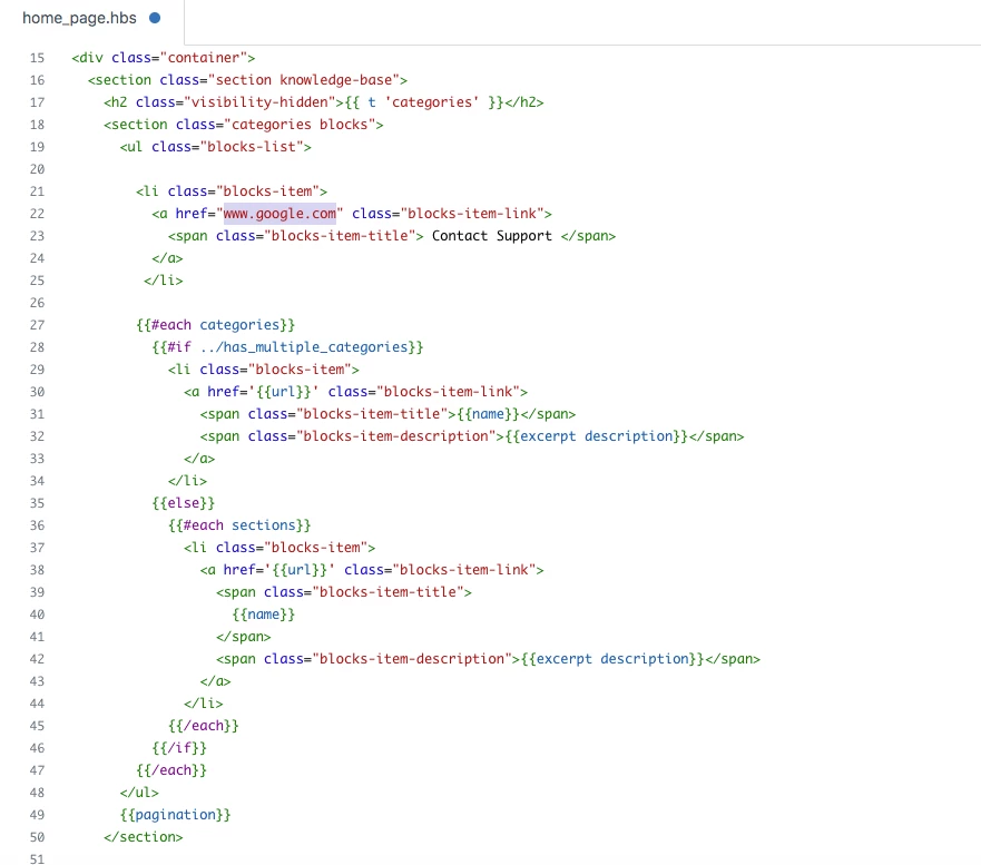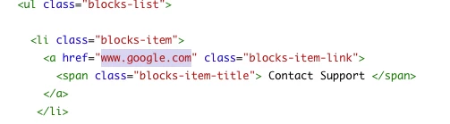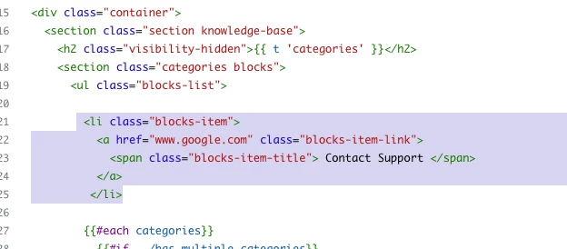 I'm trying to figure out the exact code I can use to change where our help center's category button links to.