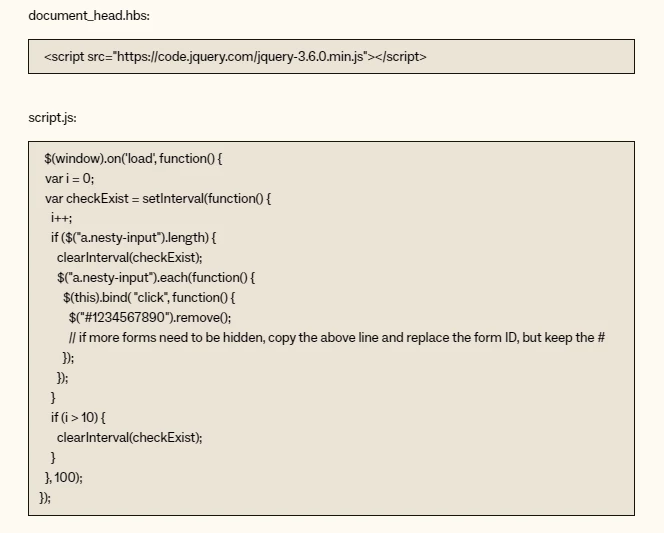 Hi! I am trying to figure out how to hide a specific ticket form from the submit request page. I had followed an old post (https://support.zendesk.com/hc/en-us/community/posts/4409217680410-Hiding-a-ticket-form-on-the-submit-a-request-page), but that solution is no longer working. Does anyone have an alternative solution to DOMNodeInserted that works? I'm new to coding and struggling to find a solution that actually works.