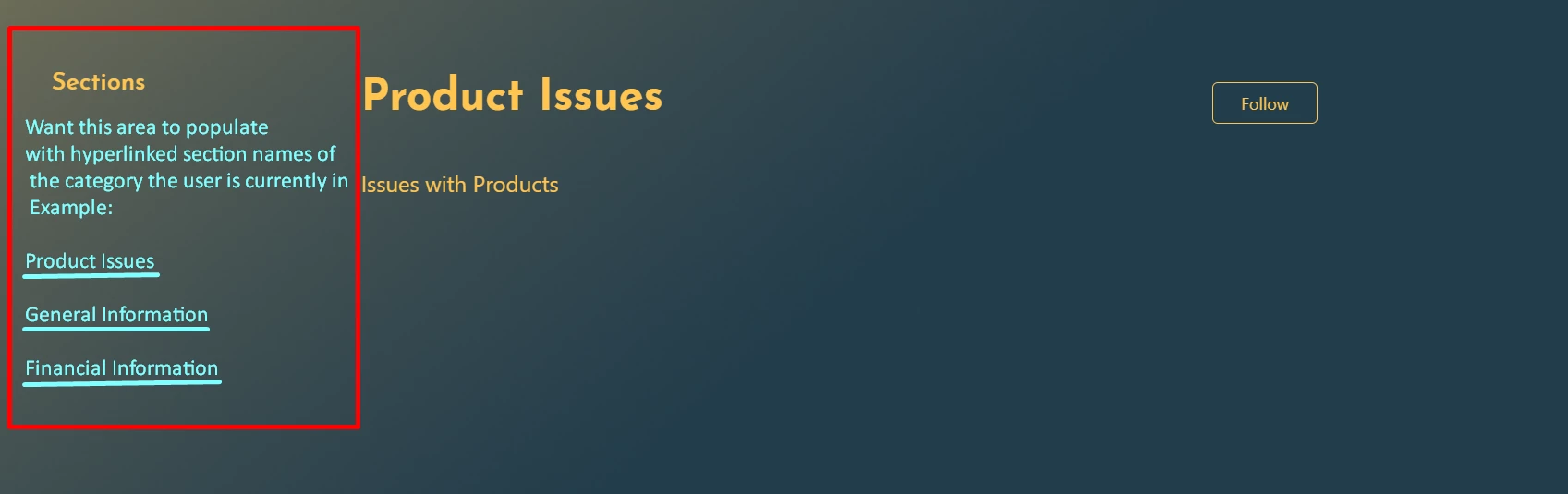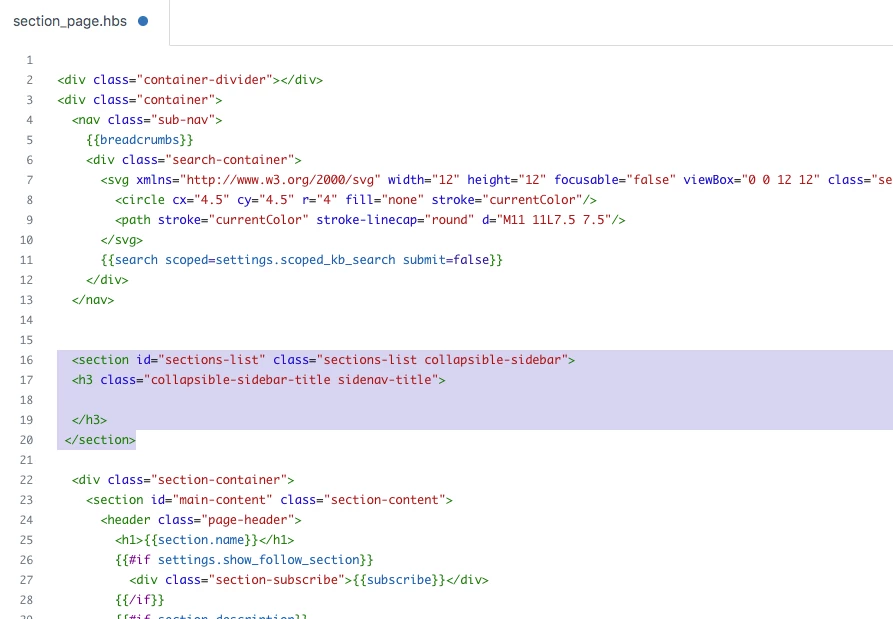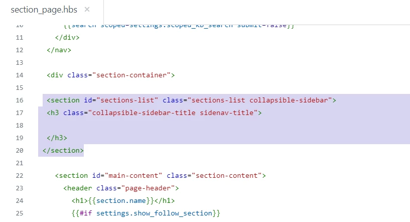 I am trying to add all sections as a list in the sidebar on the section pages. I am adding to the OOB Copenhagen theme. Basically what I'm trying to accomplish is how the articles in the section are listed in the sidebar on the article pages. I was able to mirror the sidebar setup on the sections_page.hbs. However, there doesn't appear to be helpers/identifiers to accomplish this. I do know I can list the sections of a section, but I'm looking for sections in a category. Where it also may be tricky is that I have categories that are both agent facing and end user facing, and I'd like the section list to populate for the correct category they're in.