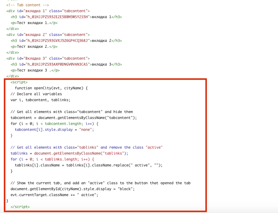 I use this HTML code<!-- Tab links --><div class="tab"> <button class="tablinks" onclick="openCity(event, 'вкладка 1')">вкладка 1</button> <button class="tablinks" onclick="openCity(event, 'вкладка 2')">вкладка 2</button> <button class="tablinks" onclick="openCity(event, 'Вкладка 3')">Вкладка 3</button></div><!-- Tab content --><div id="вкладка 1" class="tabcontent"> <h3 id="h_01HJJPZS932E2E5BBM3WSY2S5H">вкладка 1</h3> <p>Тест вкладки 1.</p></div><div id="вкладка 2" class="tabcontent"> <h3 id="h_01HJJPZS93GVXJ5Z6GP4CQ368J">вкладка 2</h3> <p>Тест вкладки 2.</p></div><div id="Вкладка 3" class="tabcontent"> <h3 id="h_01HJJPZS93AXP0DNGV0VAN3CAS">вкладка 3</h3> <p>Тест вкладки 3 .</p></div>