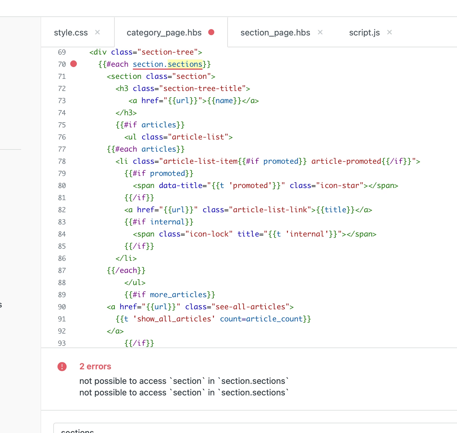}I've tried using the code I could find in the community (not exactly the one in the screenshot below, but the main problem is that I'm not able to access "section"), but I get this type of error: