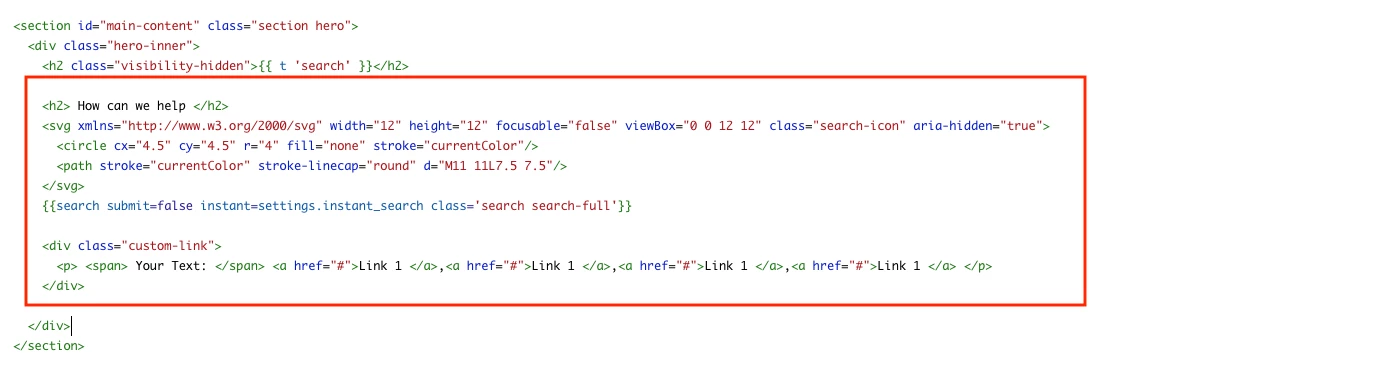 I am trying to make changes to the search box on the homepage in the help center in Copenhagen. Specifically, I wanted to add some text above and below similar to GoSpotCheck that was linked elsewhere.