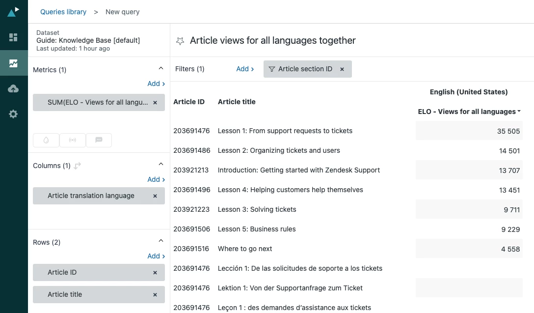 I would love to be able to have a report that shows how many views an article ID got, *regardless of language*, with a title for the article showing that a human can read. I do not want a count for each language and each article title, I can already get that just fine.